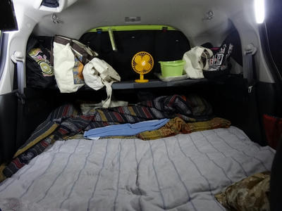 あと少しで本線に出てしまうというところに空きがあったのでそこに停めて、車中泊準備。