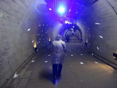 トンネルを行く。変わったライティングです。ミラーボールが回っている。