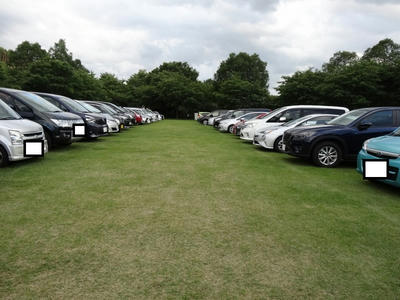 誘導されたのは原っぱの臨時駐車場。公園入口からは少し遠いけど、緑が気持ちいい。