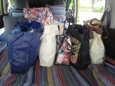 右から、お風呂セット2つ、洗面バッグ、着替えバッグ2つ。