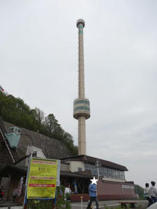 弥彦山パノラマタワー 展望スペースが回転しながら上がっていくらしいが、この時は強風のため動いていなかった。