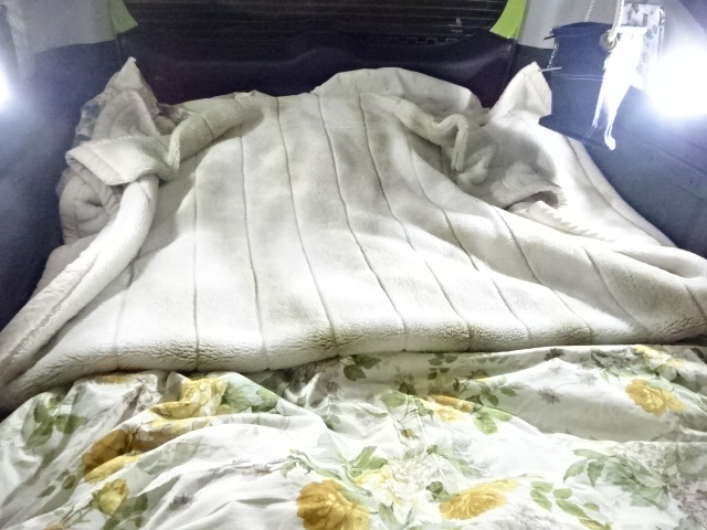 その上にタオルケット、その上に薄手の羽毛布団(家で発見された)、その上に厚手の毛布という厳重ぶり。