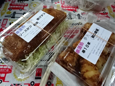 しかし、駅前にはコンビニもスーパーもなく、仕方ないので居酒屋さんが作っていた鶏のから揚げやソースカツ、イカ焼きなどを買って車内で食べることにした。