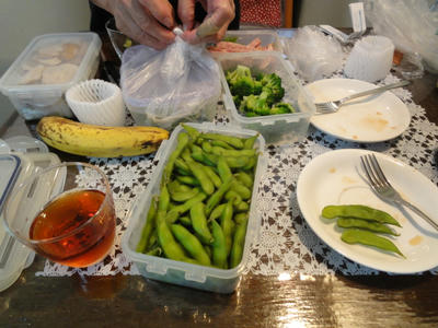 ブロッコリーと枝豆は茹でてから冷凍保存しておいたので、今ちょうどよくなっています。枝豆おいしい!