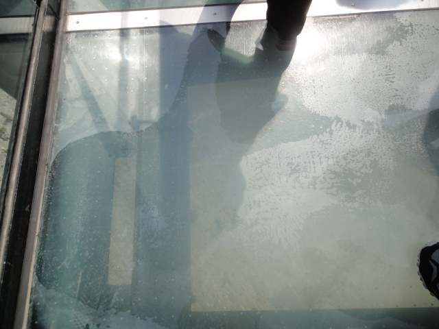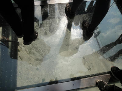 グレーシャースカイウォークは谷間に突き出した展望台で、床がガラス張り。ガラスが割れたらどうなるんだろう?と思いながら思いっきり楽しんでしまう。