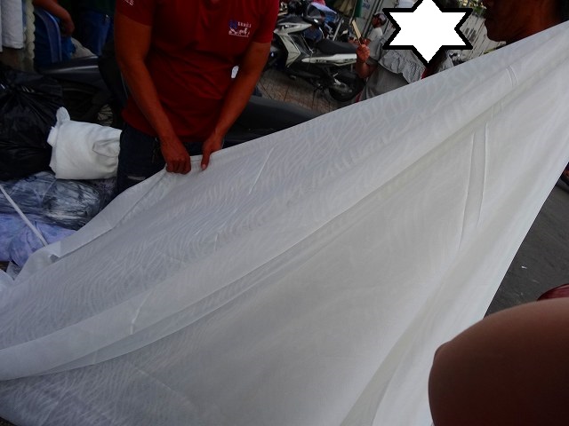 しばらくして戻ってくると、店の前の道路で生地を広げ始めた。