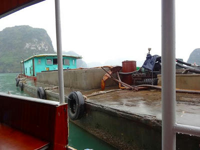 ガソリン船が近寄ってきて、給油していた。船というより浮かぶコンクリートみたい。