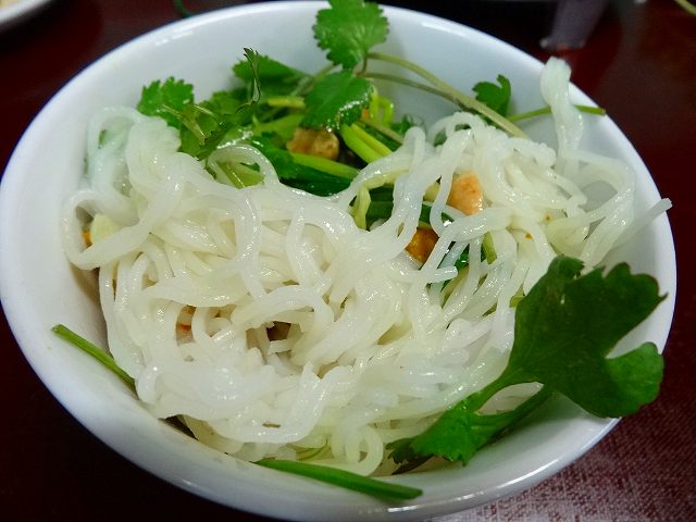 昨夜はライスペーパーで包んだが、今日はブンと香草と魚をタレに混ぜていただく。