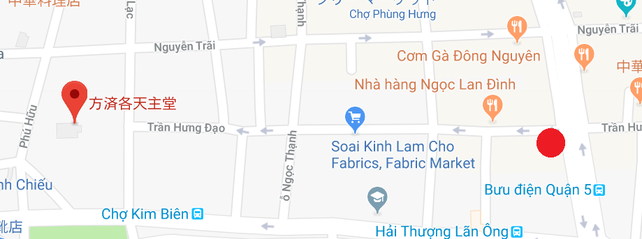 「方済各天主堂」がチャータム教会。そこからまっすぐ東に行くと、赤丸印のところにカーテン生地店がたくさんあった。