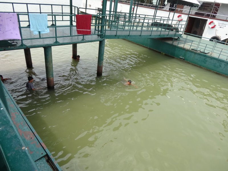 桟橋では子供たちが泳いで遊んでいた。