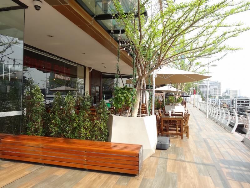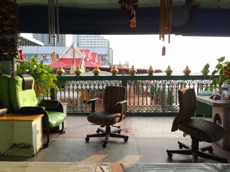 右側にはチャオプラヤー川が流れている。向こうの赤い屋根は、別のマッサージ店が入っている。この建物の下も別のマッサージ店。でもあまりお客さんはいない。ここだけ繁盛しているのだ。