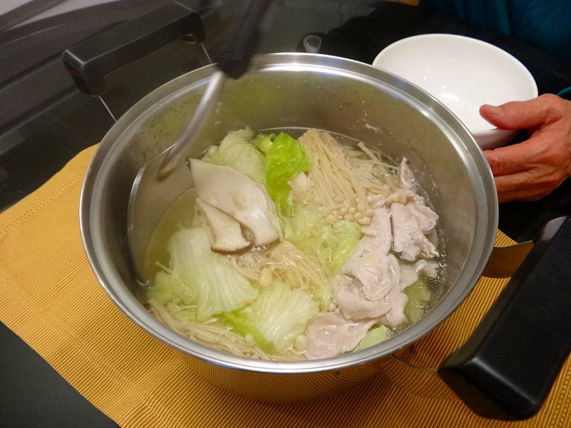 5時までお昼寝して6時には夕食。野菜をたくさん食べられるから鍋はいいね。ごまだれが効いてる。