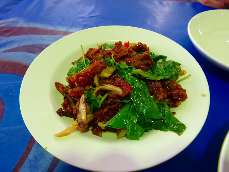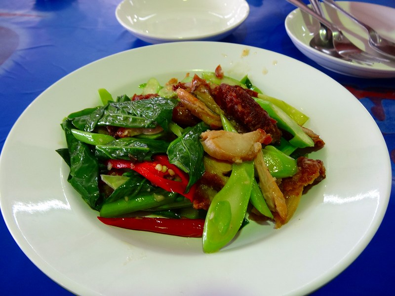 写真があったのでチキンのフライと野菜の炒め、フライと野菜サラダを注文。テーブルで待っていると届けてくれた。ライスも付くが、要らないと断った。味付けは濃いけどおいしい。ご飯にぴったりの味だ。