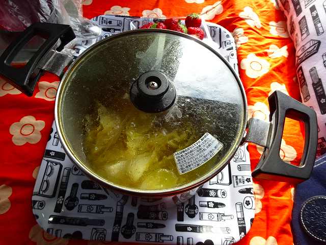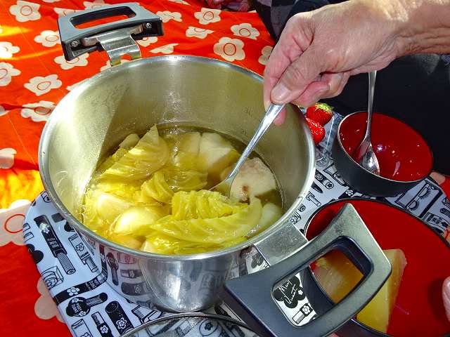 昨夜のうちに保温調理鍋でポトフを作っておき、今朝再び火を入れて、保温鍋に入れて持ち運ぼうという計画。