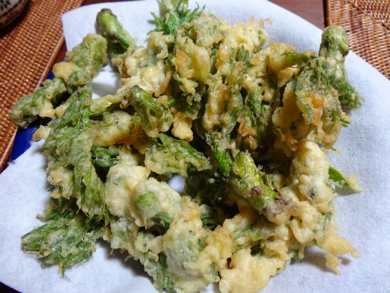 この日の夕食はカニ汁といわし焼きと山菜のてんぷら。