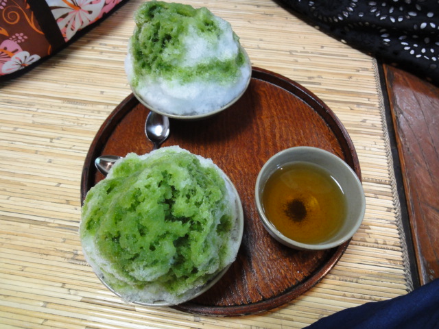 かき氷に抹茶シロップと中にはこしあんと白玉?おもち?が入っている。美味!