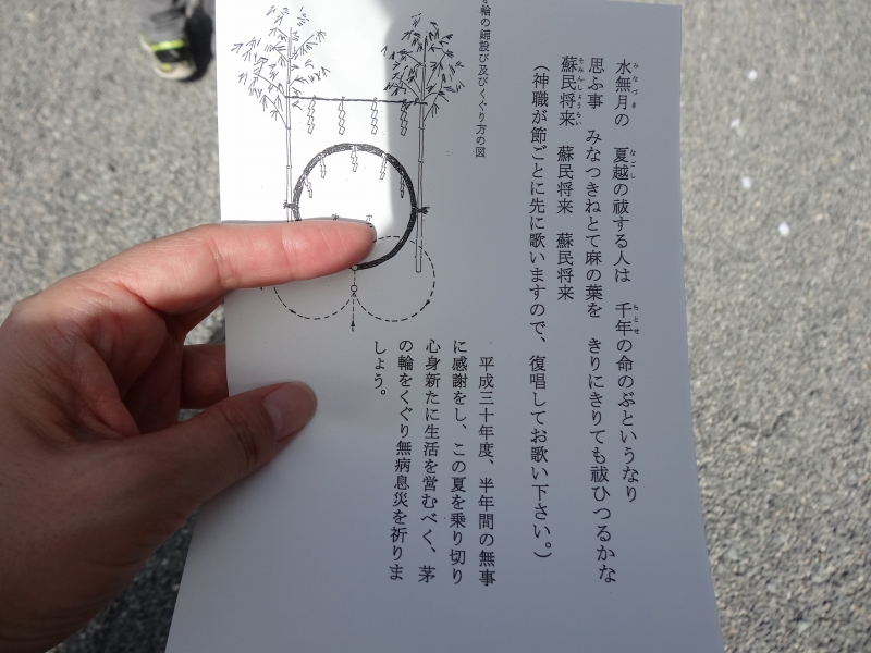 茅の輪くぐりをする時には紙に書かれているように歌を歌いながら。