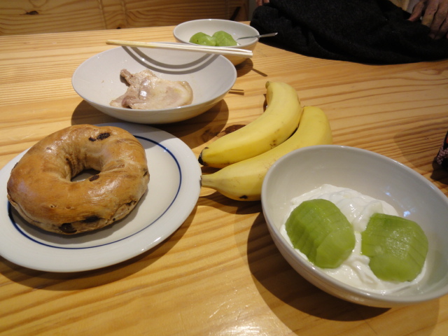 今日の朝食はジャスパーで買ったヨーグルトとキウイとベーグル。