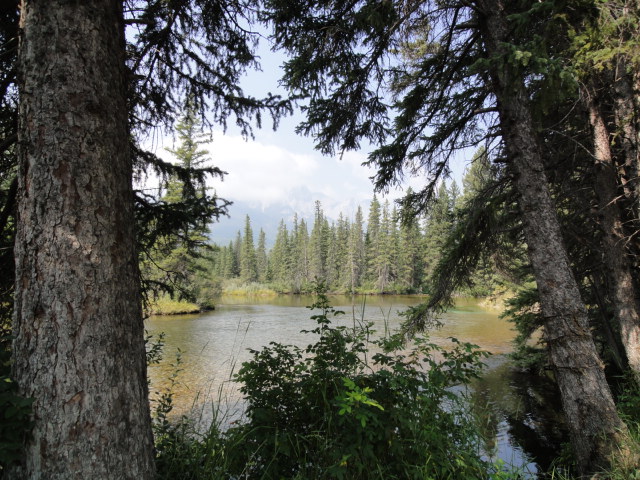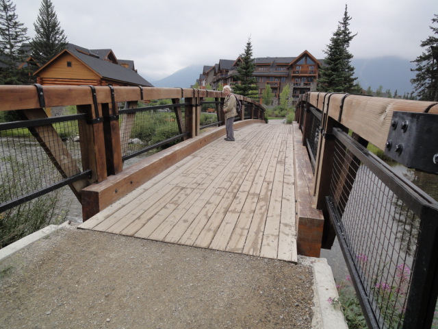 小さなキャンモアのメインストリートはあっという間に終わり、川沿いにトレイルがあったので歩いてみることにした。天気がよかったらよい景色なんだろうけど…。ま、川がきれいだからいいかな。