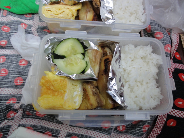 今日は、宿にお米があったのでいただいてお弁当。ナス炒めと玉子焼き♪