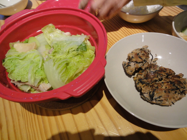 ハンバーグのつもり。というか、最近の我が家のハンバーグは豆腐入りなので、今回は高野豆腐入り。つなぎを入れないのでばらばらになってしまうのが難点。だが味は満足。いつものように温野菜で栄養も満点。