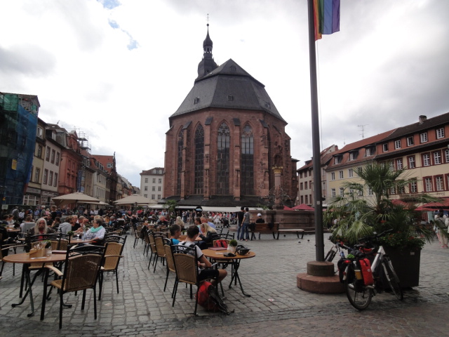 マルクト広場の周囲は飲食店がいっぱい。外で大勢の人が食事を楽しんでいた。聖霊教会が中央に見える。