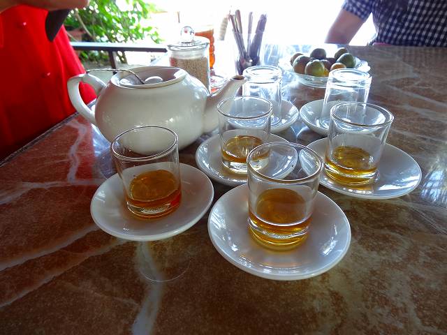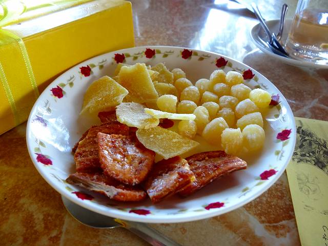 一緒に出されたお茶菓子。甘くておいしい。ショウガの砂糖漬けはおいしかった。