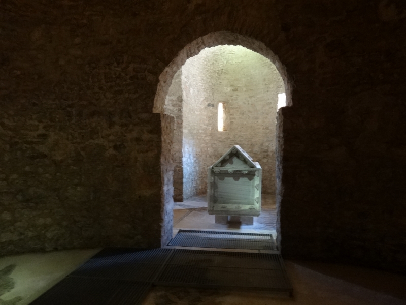 古い時代の教会の上に新たに教会を建てたようだ。昔のモザイクの床が見える。