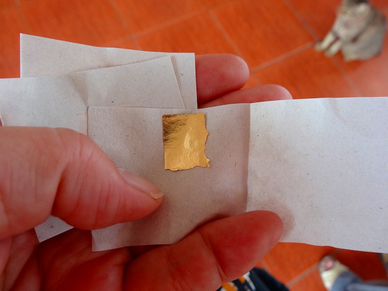 お線香を買うと、金の紙が3枚ついている。これを仏像に貼り付けて合掌。